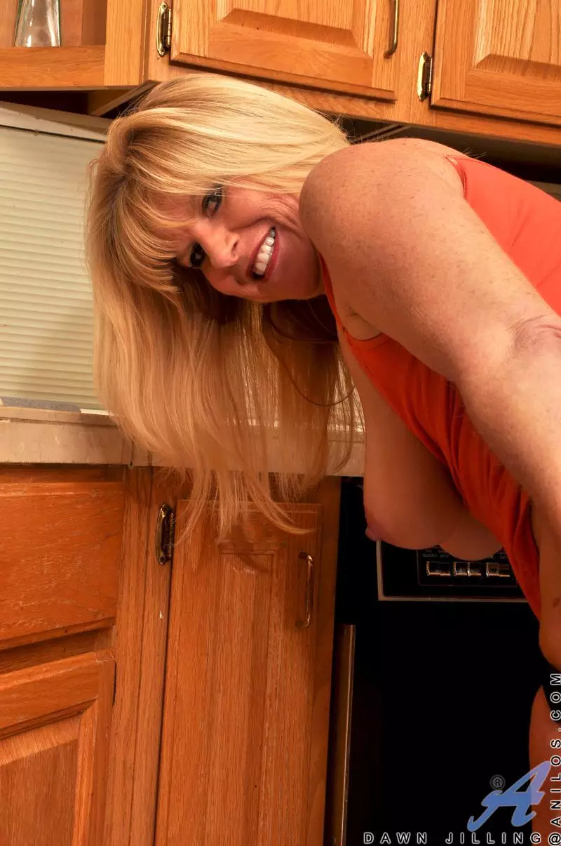 Грудастая мамочка-блондинка Dawn Jilling без трусиков на кухне, играет с горячей киской — Dawn Jilling