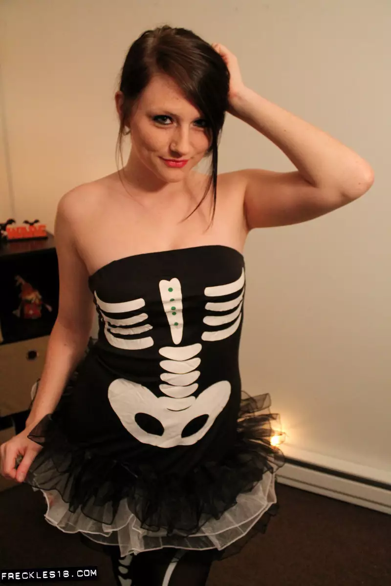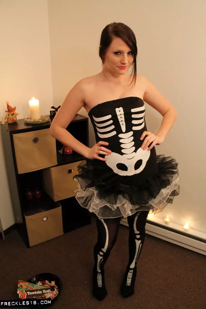 Ошеломительная брюнетка Freckles соблазняет своими колготками и костюмом на Halloween — Freckles
