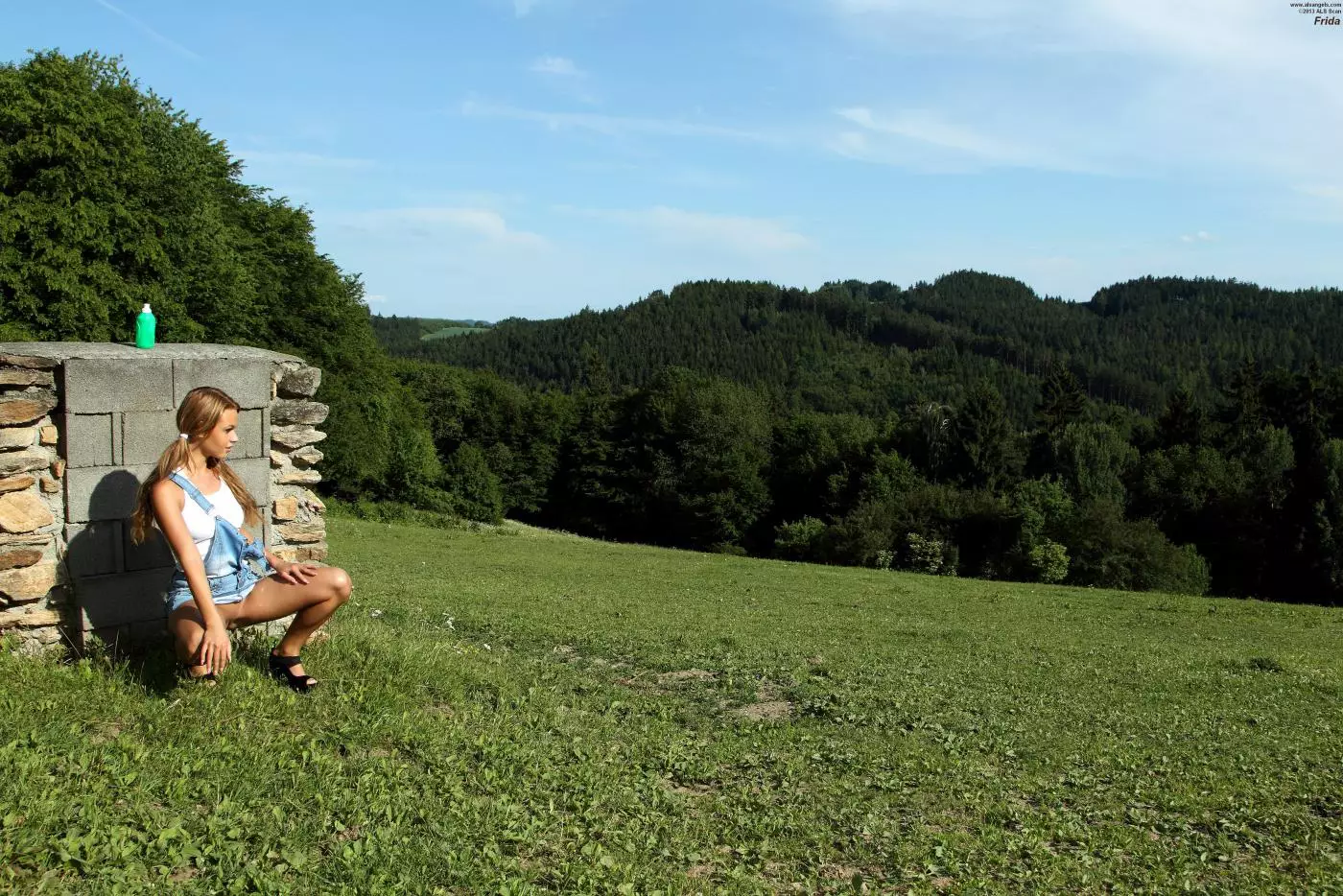 Восхитительная блондинка Frida Stark с побритой киской снимает одежду и позирует для нас на природе — Frida Stark