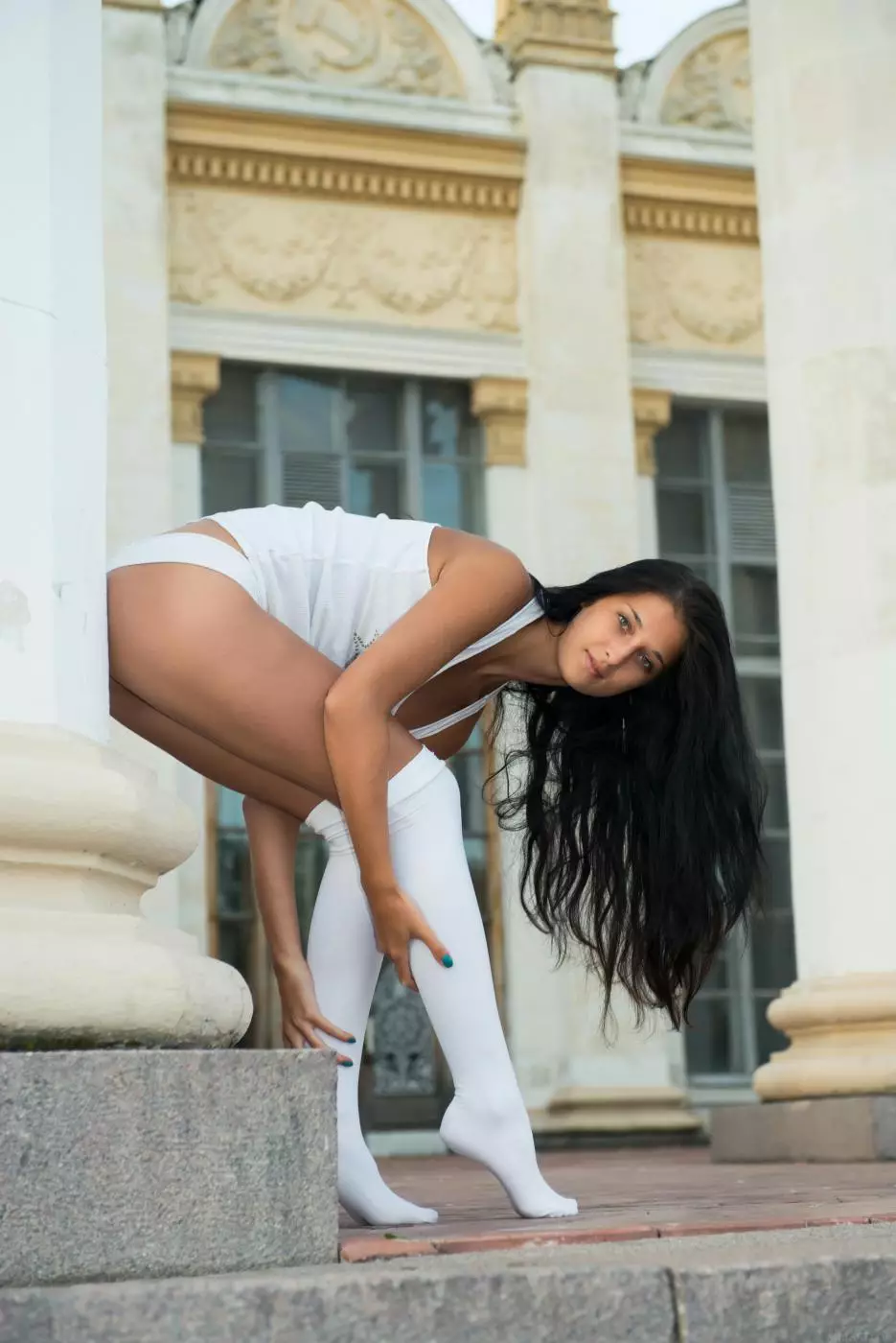 Богиня-брюнетка только в гетрах Katya AC позирует на свежем воздухе — Katya AC