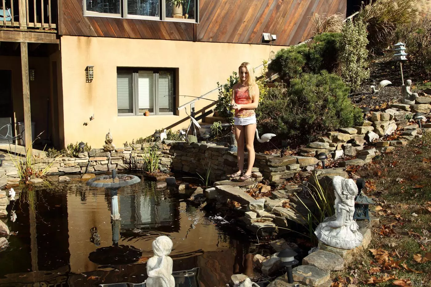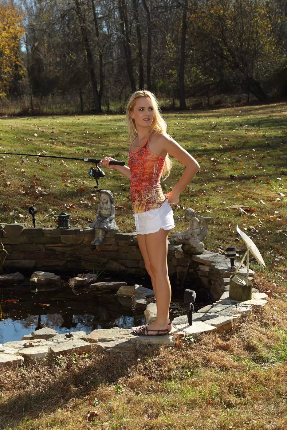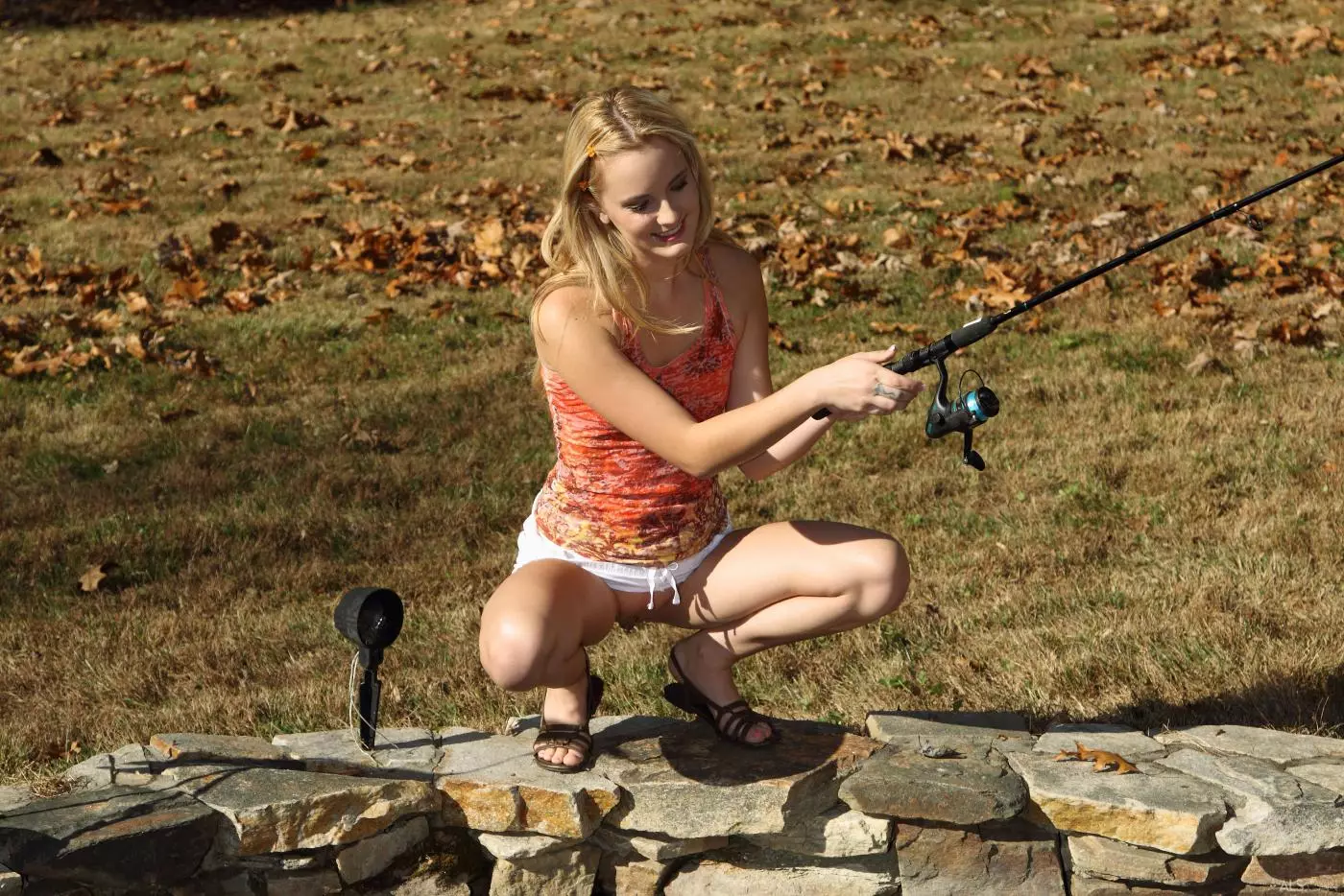 Милая детка Sara James показывает свою киску и сиськи на природе, занимаясь рыбалкой — Sara James