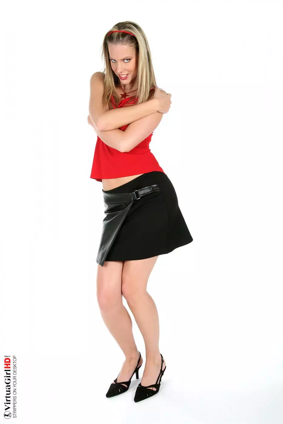 Горячая блондинка Bernadette срывает с себя красный топ и черную мини юбку — Bernadette