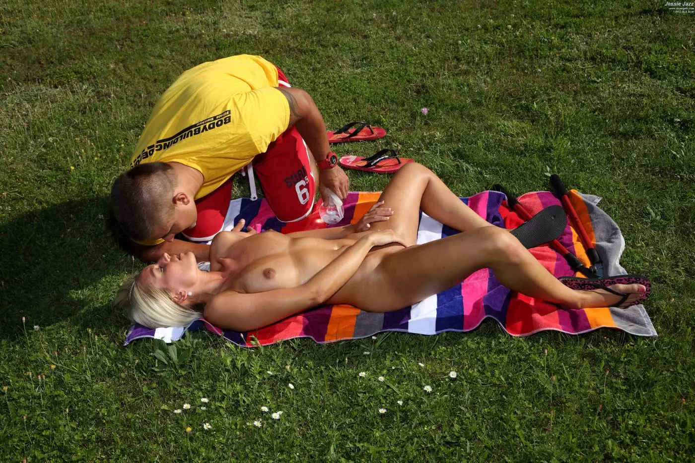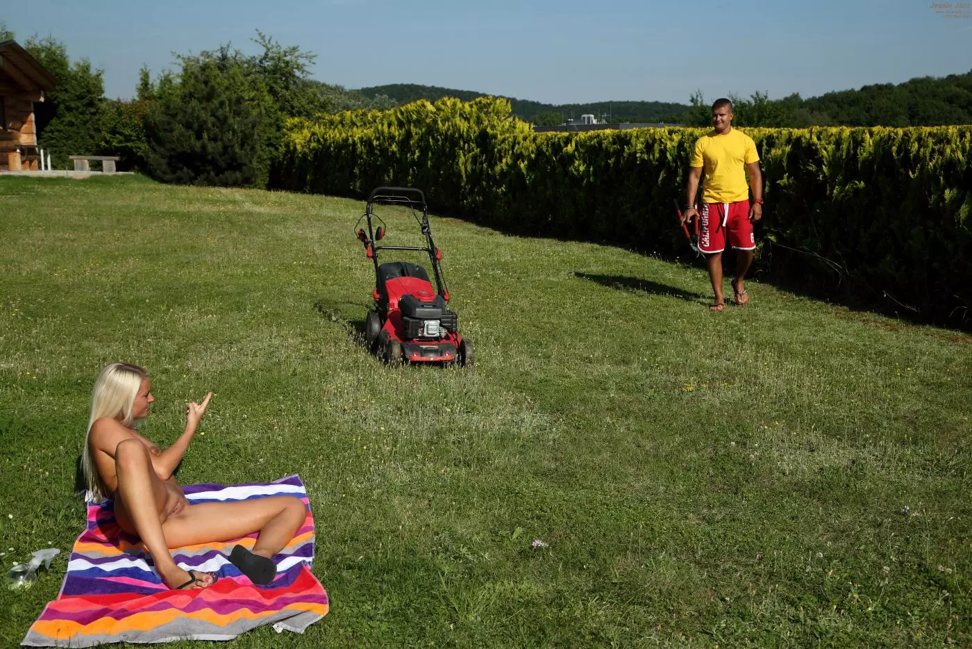 Горячую блондинку Jessie Jazz трахает на лужайке, рядом с инструментами, владелец сада — Jessie Jazz