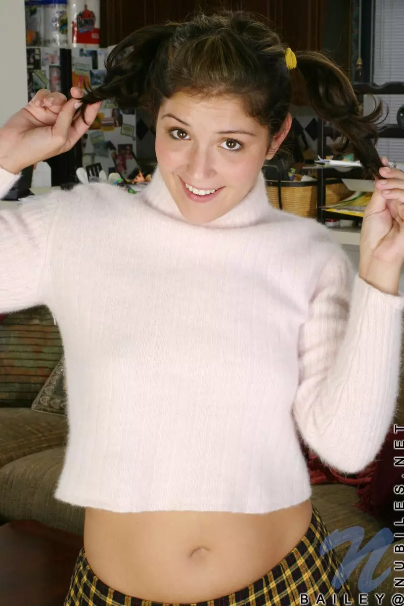 Шаловливая брюнетка Bailey Nubiles со смешными хвостиками снимает клетчатую юбку и показывает лобок — Bailey Nubiles