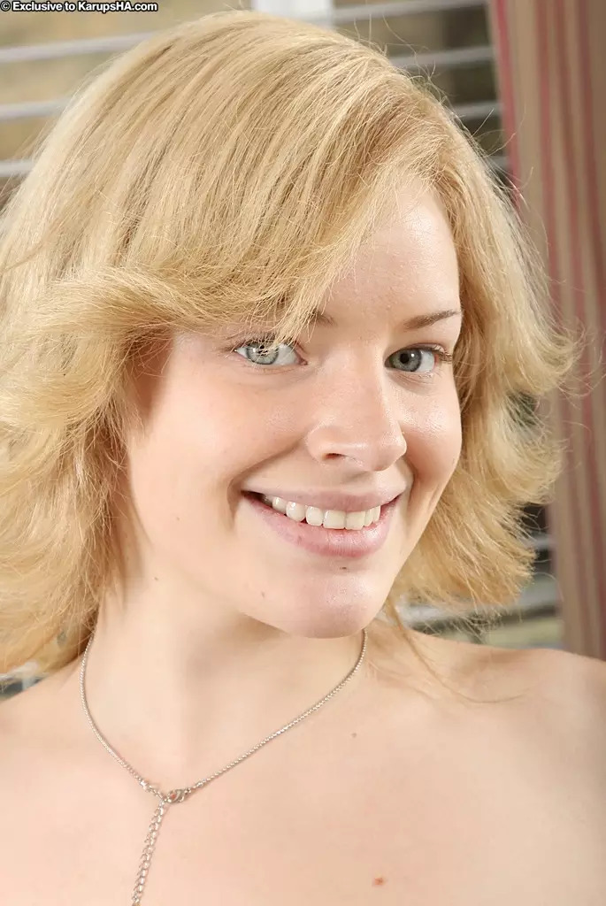 Выбритая улыбающаяся блондинка-подросток Ally Ann раздевается до гола и выставляет на показ свою розовую киску — Ally Ann