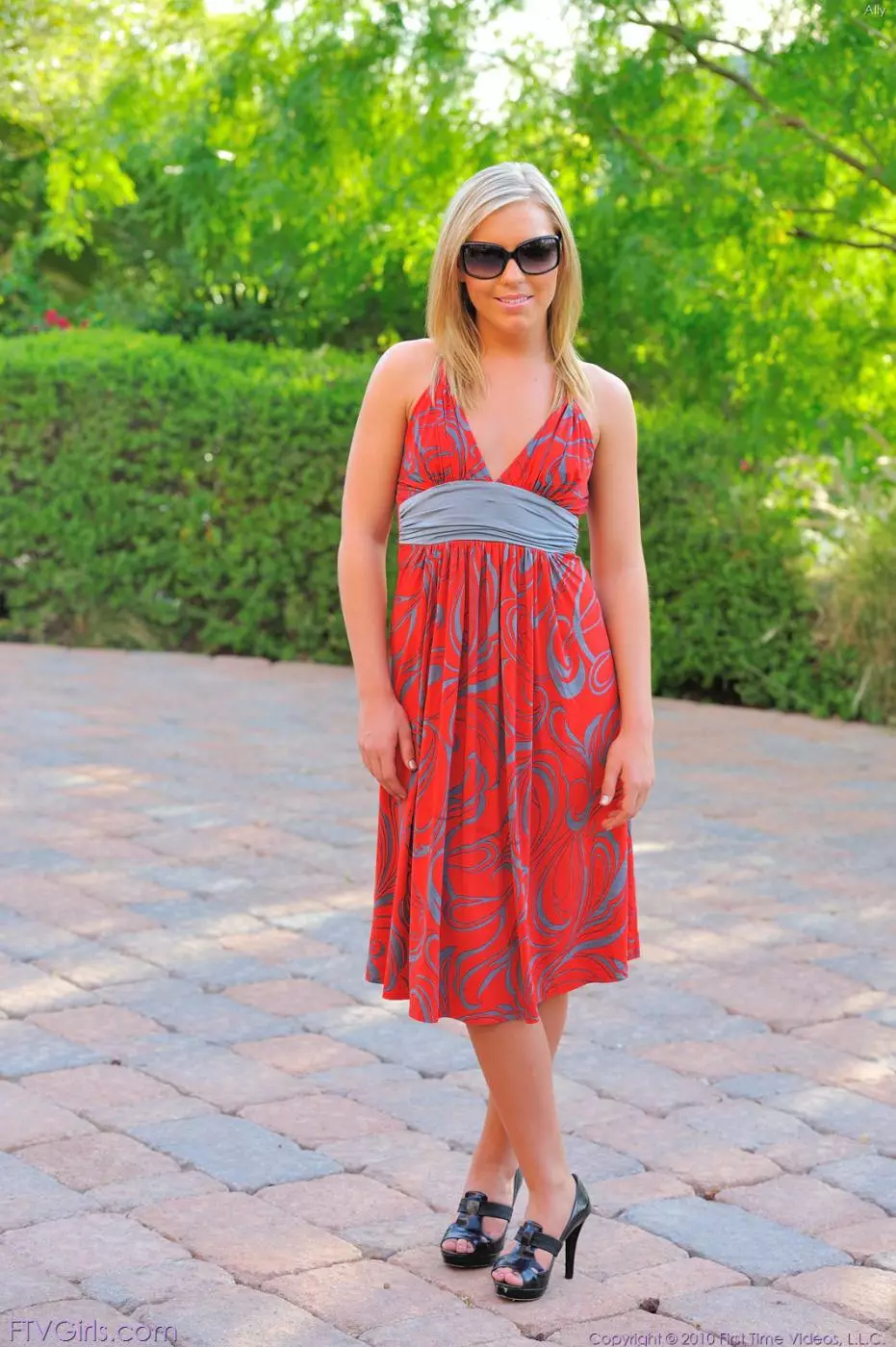 Блондинка Ally Kay в красном платье, снимает трусики и трахает себя в киску огурцом — Ally Kay