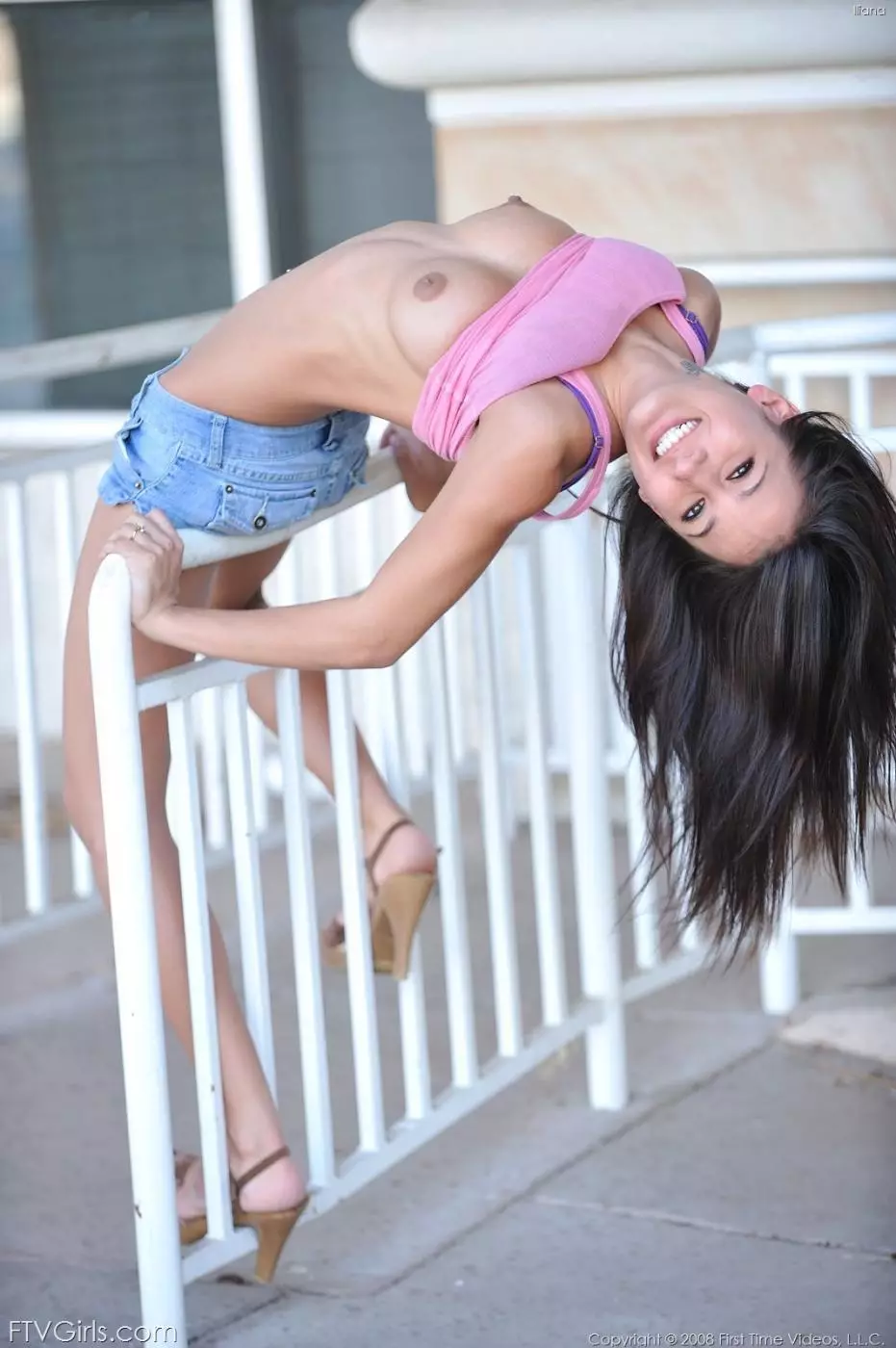 Улыбчивая молоденькая брюнетка Amia Moretti снимает свою розовую маечку, голубые шорты и красные трусики на улице — Amia Moretti
