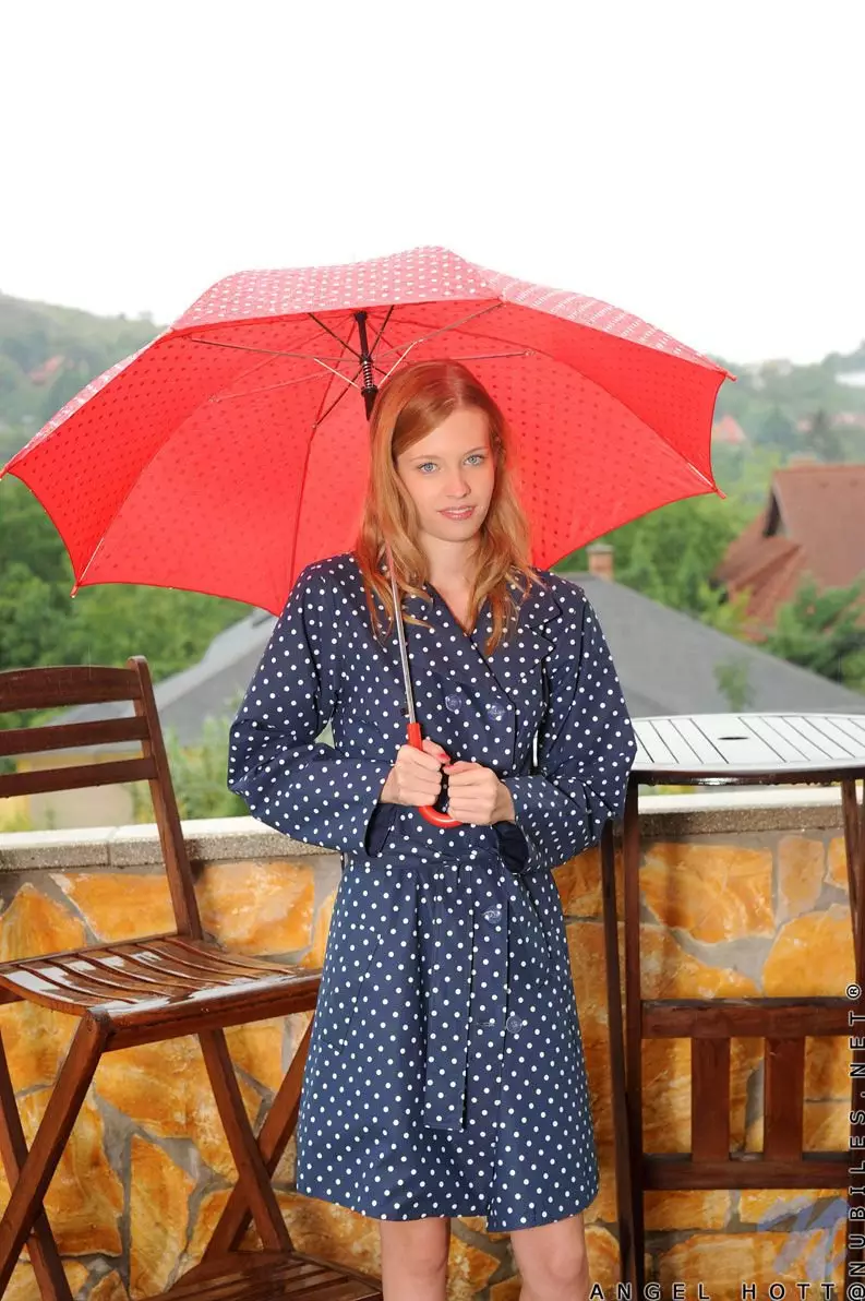 Улыбчивая малышка Angel Hott демонстрирует свою бритую киску и сиськи на воздухе под зонтом — Angel Hott