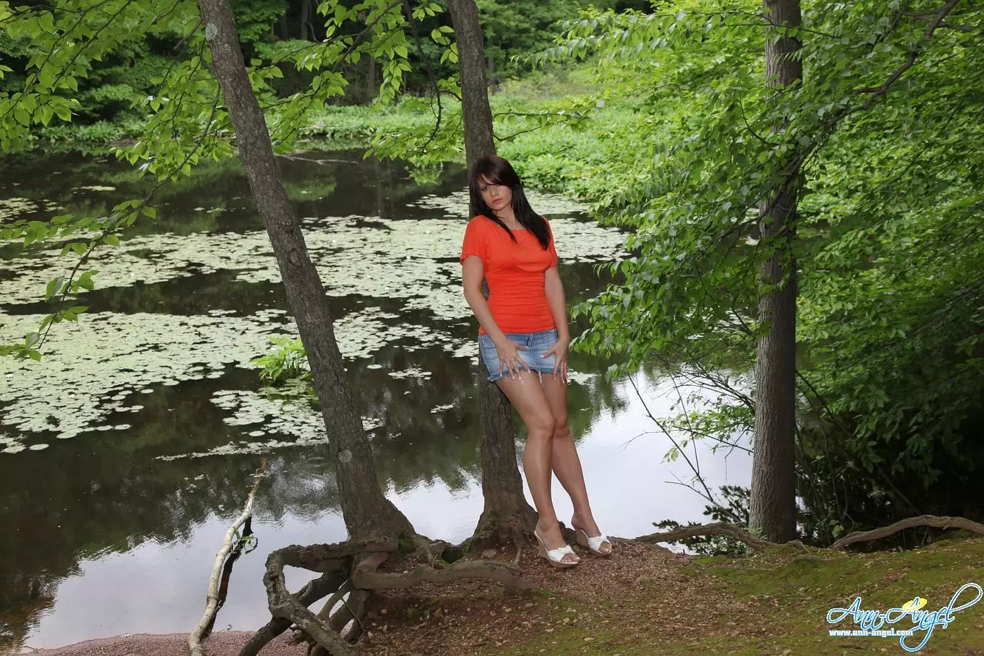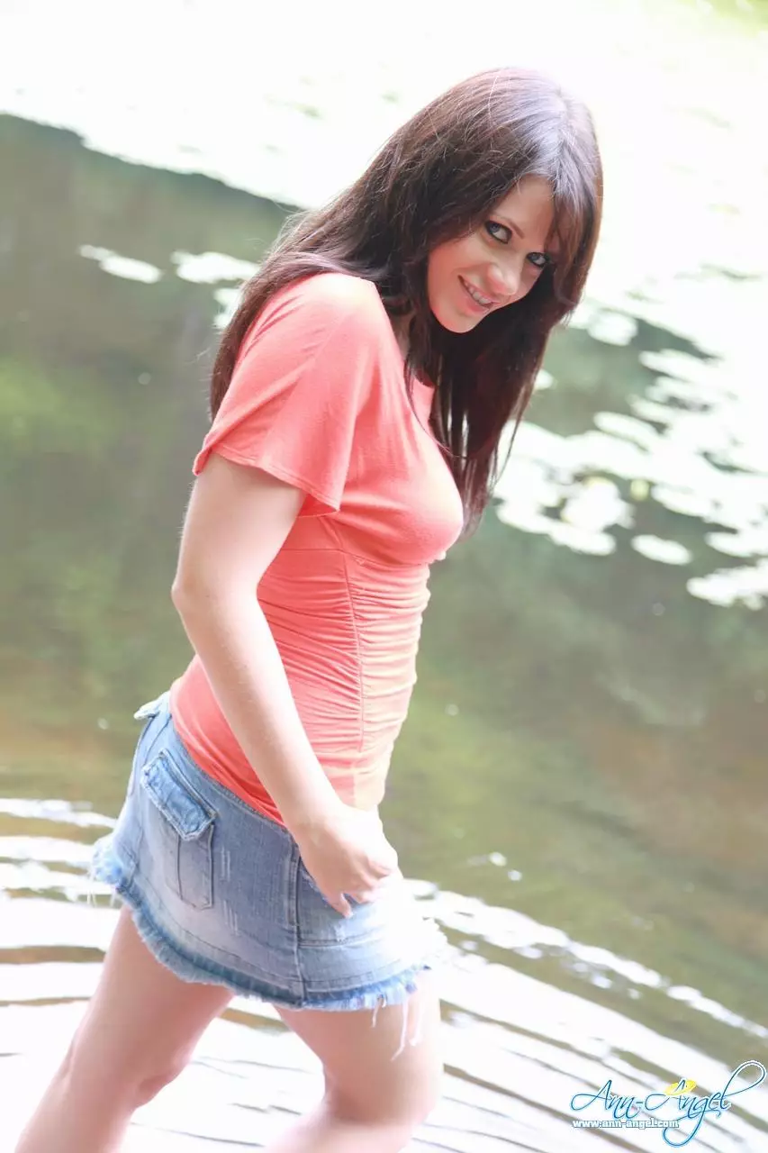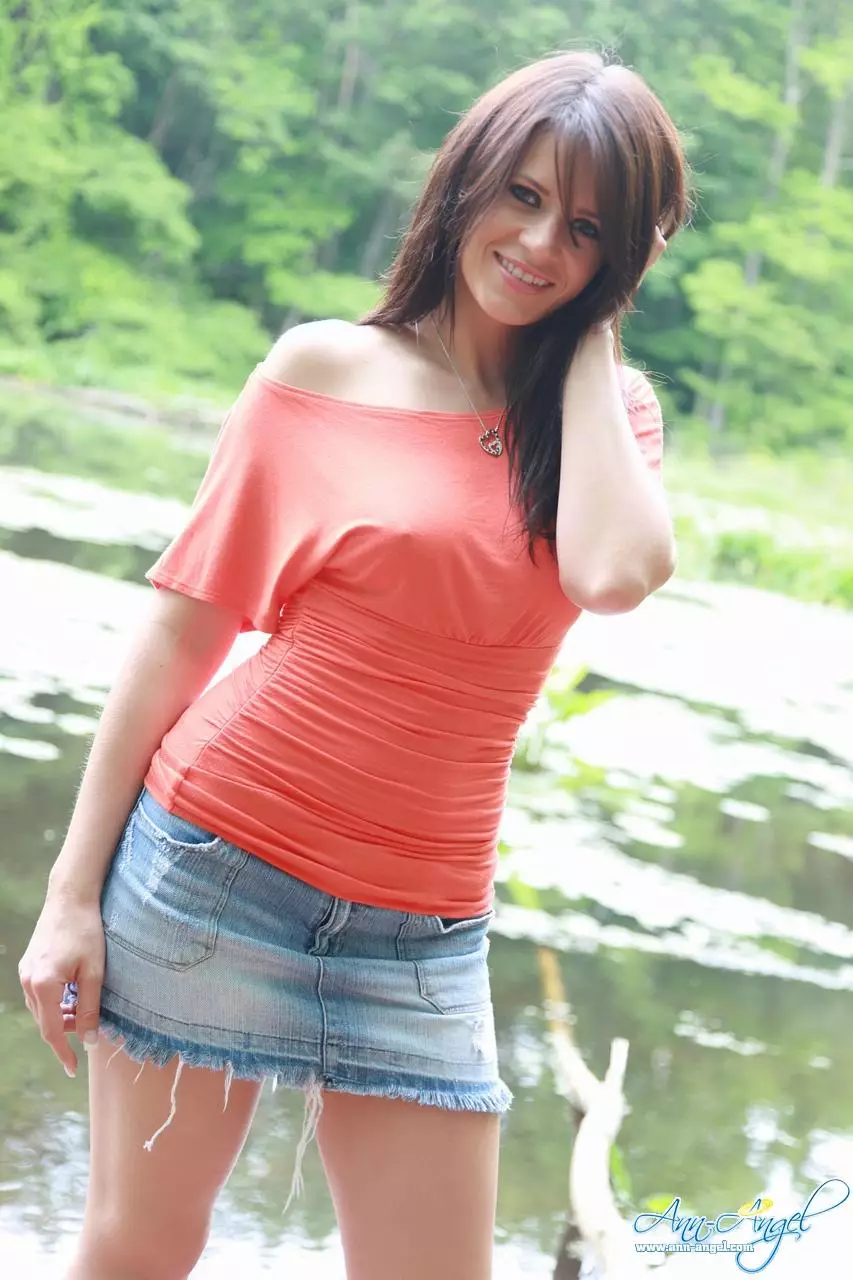 Милая красотка в синей джинсовой мини-юбке и красной майке Ann Angel принимает позы на берегу реки — Ann Angel