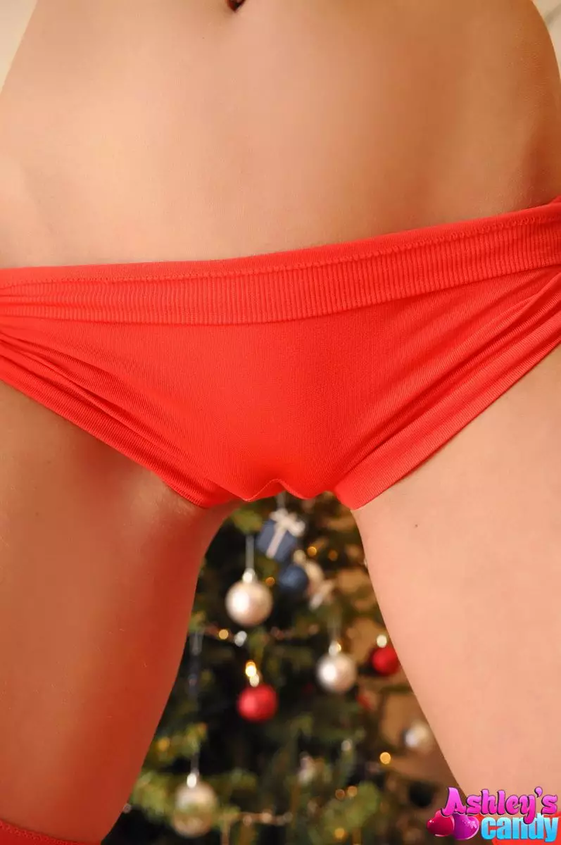 Голубоглазая блондинка в красном рождественском наряде - Ashley Candy, ласкает свои крошечные сосочки — Ashley Candy
