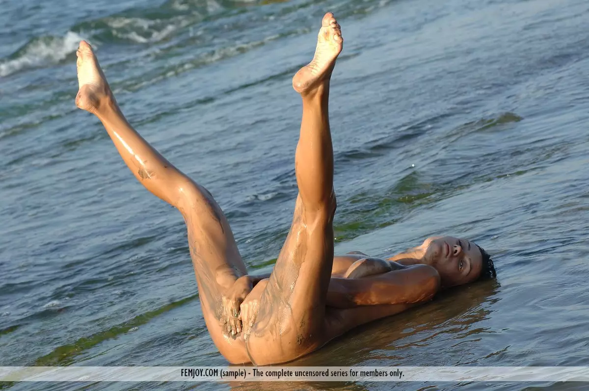 Брюнетка Atena A разделась в воде, прикрывая тело грязью — Atena A