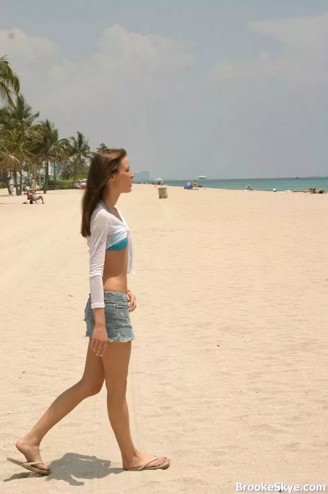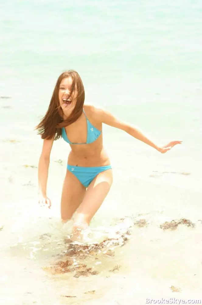 Манящая девочка с чарующей улыбкой Brooke Skye позирует в голубом бикини на пляже — Brooke Skye