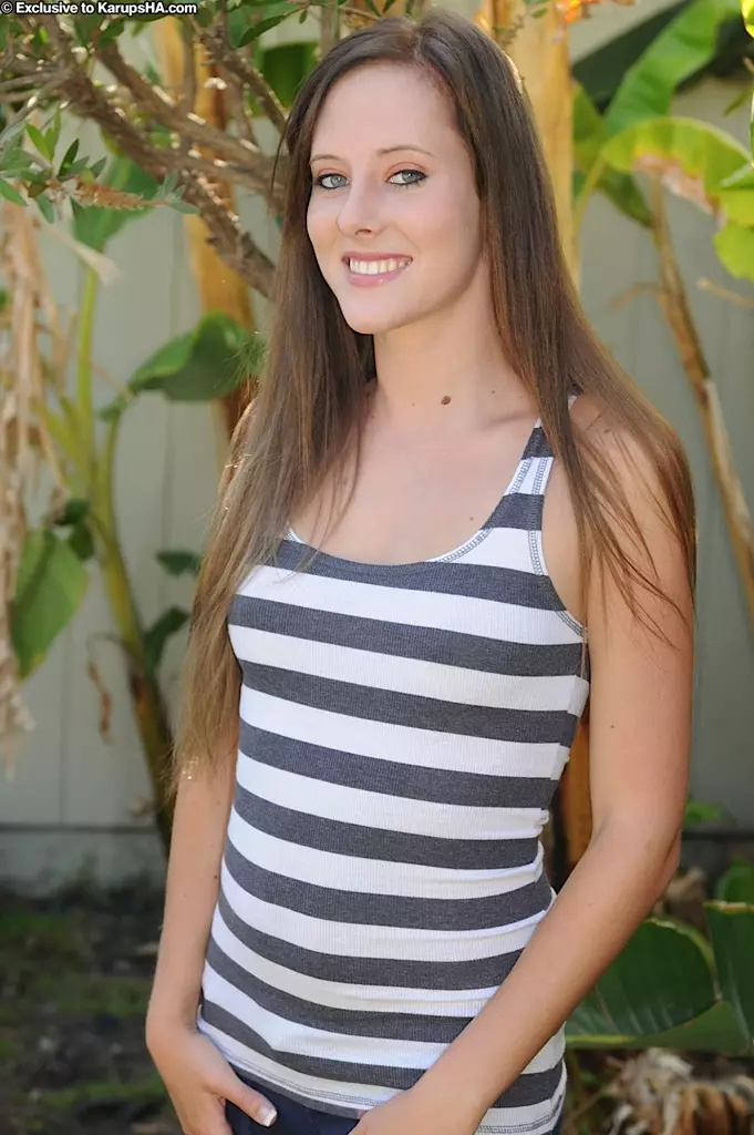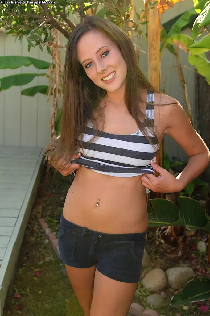 Миниатюрная Callie West с маленькими сиськами и красивой улыбкой показывает свою гладкую киску в саду — Callie West