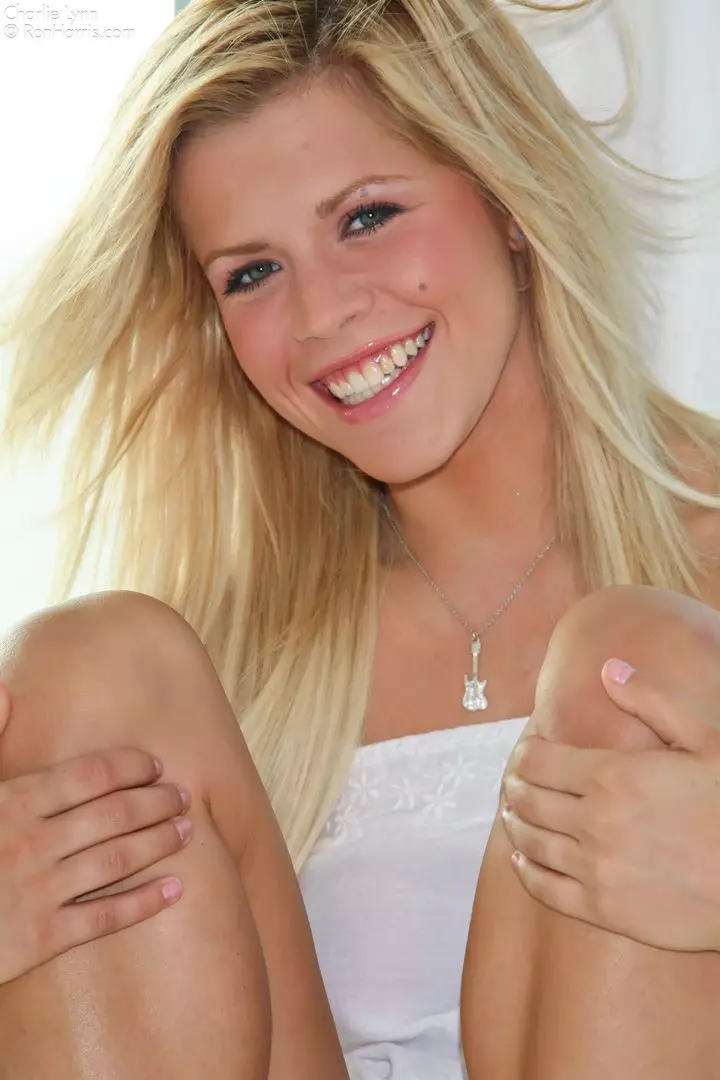 Белокурая шалава Charlie Lynn улыбается во все зубы когда раздвигает ножки и трогает сама себя — Charlie Lynn