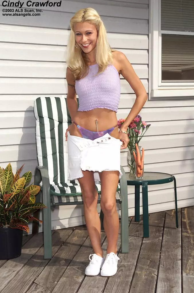 На сладкую попку Cindy Crawford надеты красивые фиолетовые стринги, а потом она показывает пирсинг на киске — Cindy Crawford