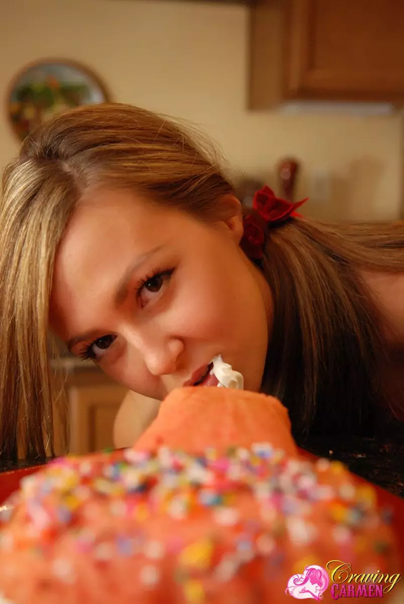 Развратная малышка с милыми маленькими сиськами и лысой киской - Craving Carmen ест пирог на кухне — Craving Carmen