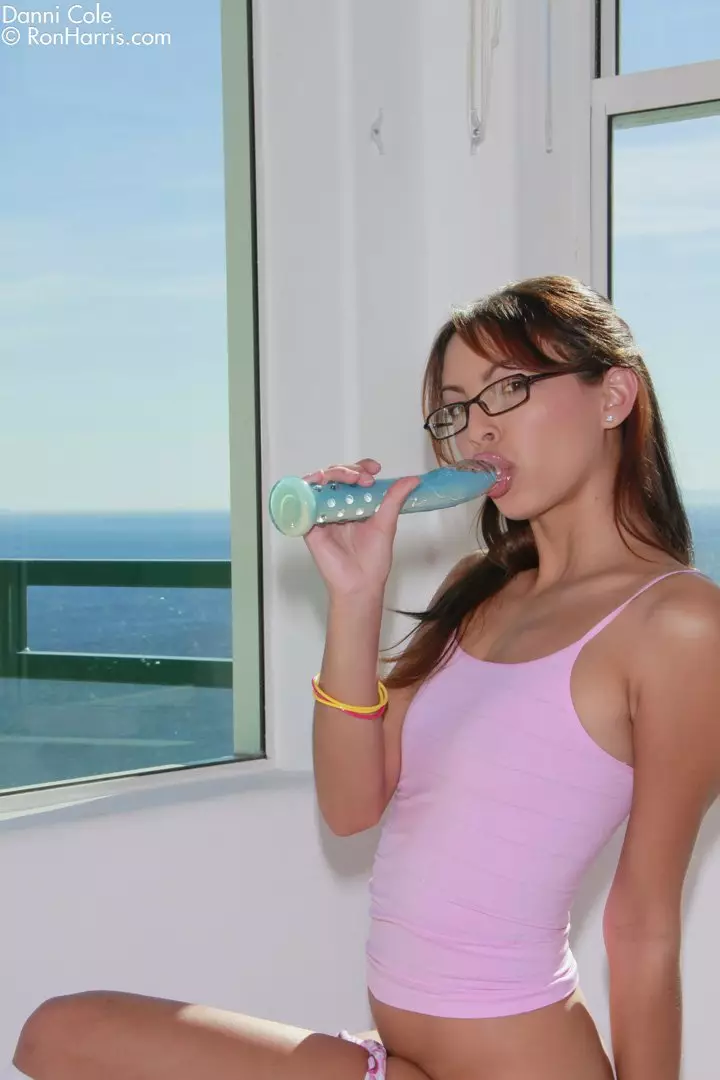 Девочка-подросток в очках и розовом белье Danni Cole заглатывает стеклянное дилдо — Danni Cole