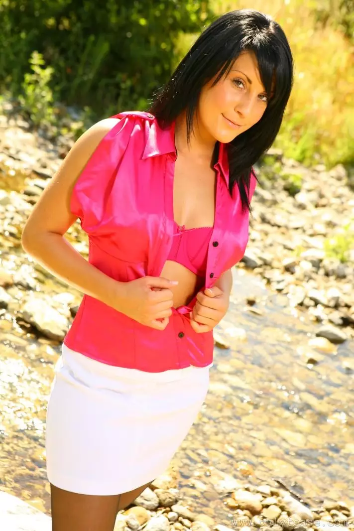 Кошечка в колготках Emily J снимает свою короткую белую юбку и лифчик на свежем воздухе — Emily J