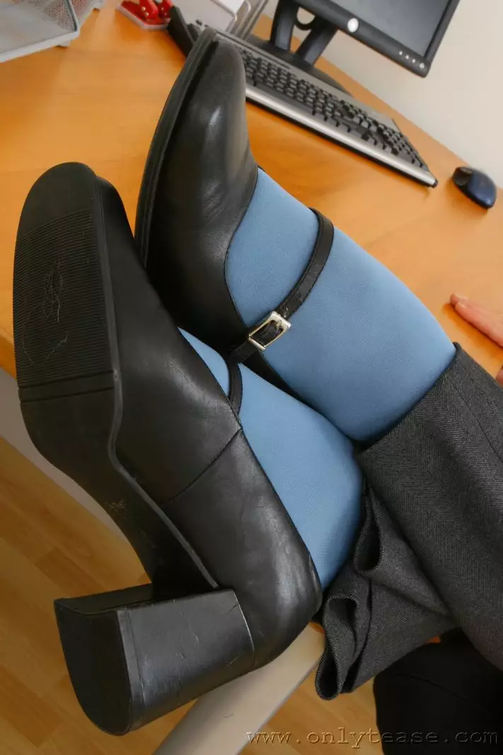 Блондиночка Emma Onlytease в голубых колготках и зеленом нижем белье раздевается в офисе — Emma Onlytease