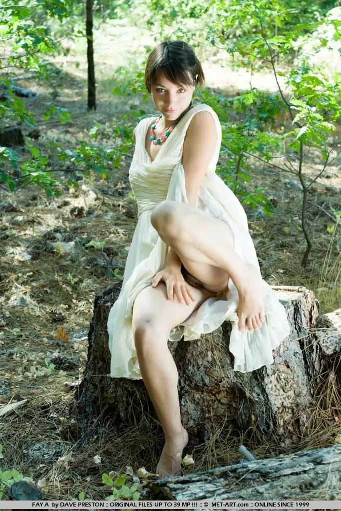 Привлекательная, волосатая девочка в белом платье Fay A показывает свою киску в лесу — Fay A