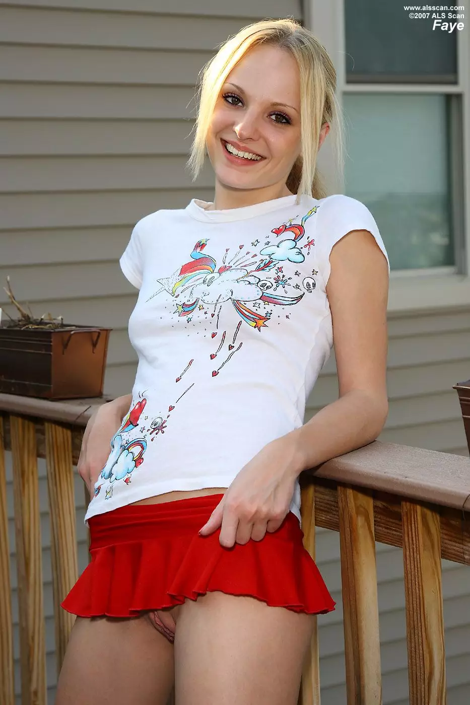 Блондиночка в крошечной красной юбке Faye Runaway показывает свою розовую, узкую киску на природе — Faye Runaway