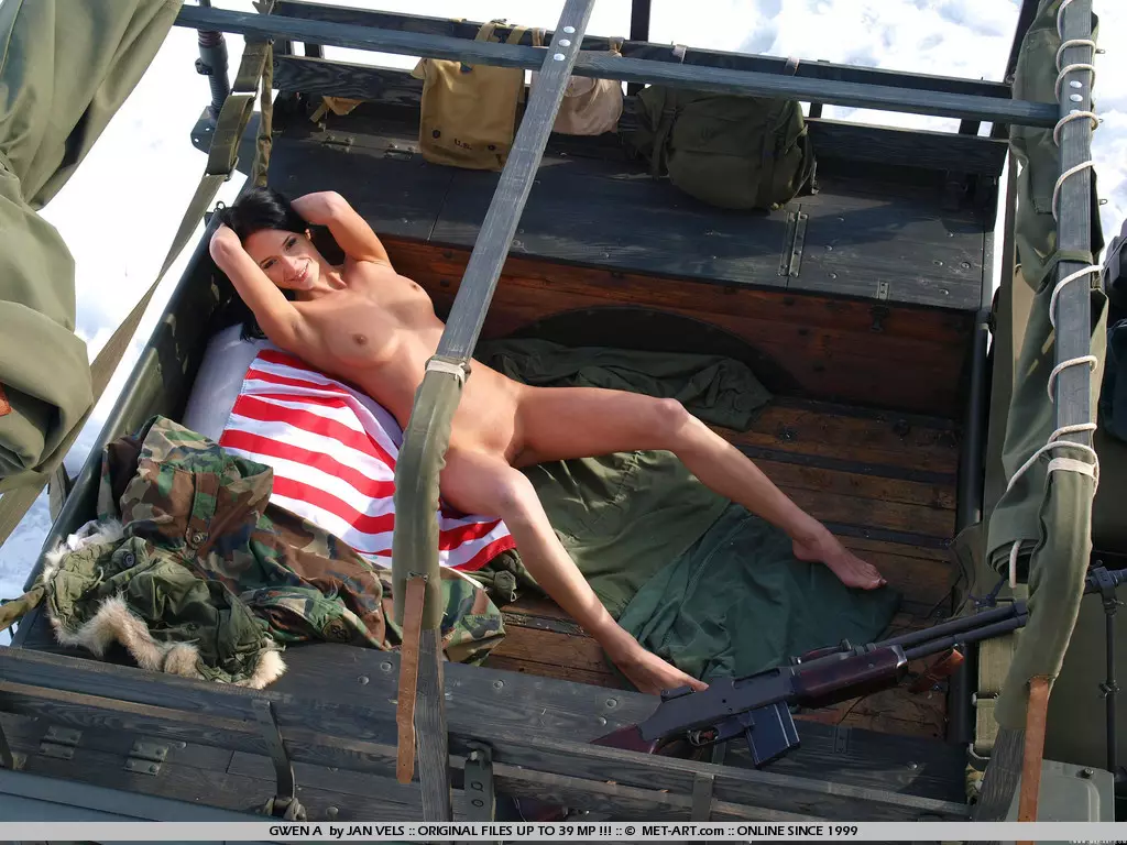 Развратная Gwen A позирует голой в военном грузовике посреди заснеженной пустыни — Gwen A