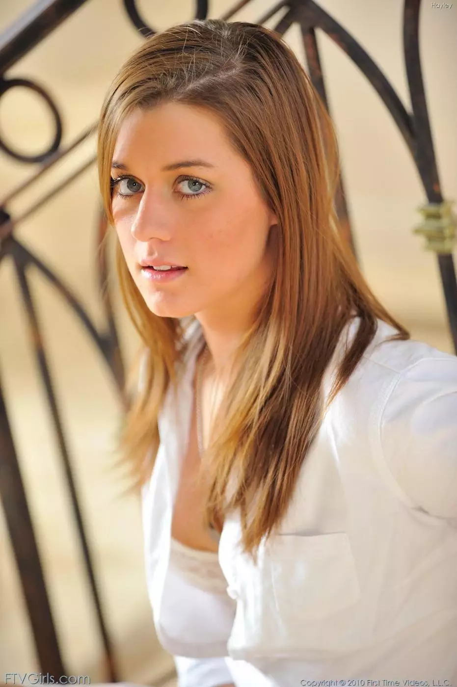 Красотка на каблуках и в короткой юбке Hayley Hanes снимает трусики на лестнице — Hayley Hanes