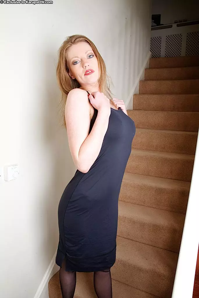 Грудастая мамочка в чулках Holly Kiss снимает свое платье и стринги на лестнице — Holly Kiss