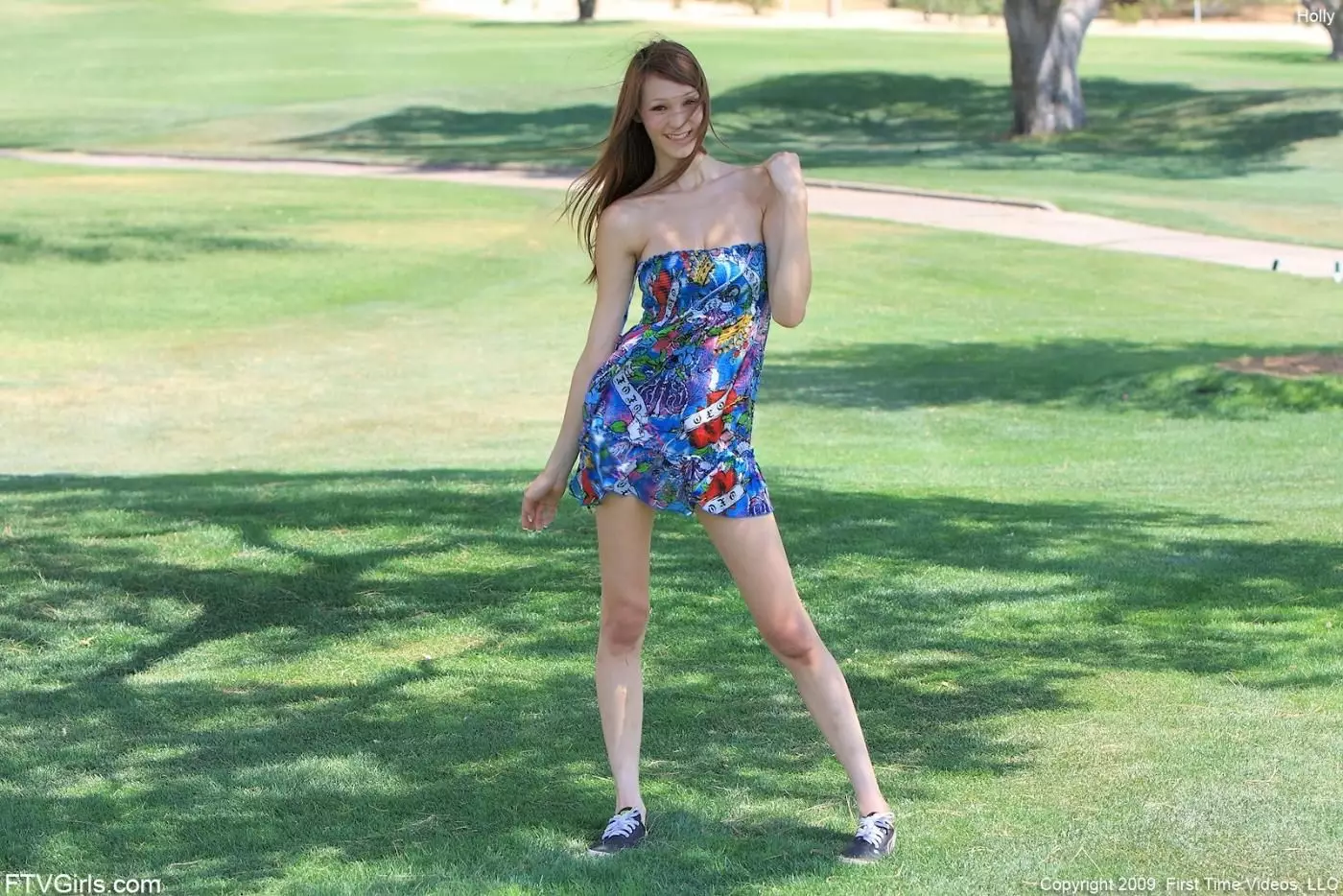 Бледная девушка Holly Michaels задирает свое синее платье и раздвигает киску в людном месте — Holly Michaels