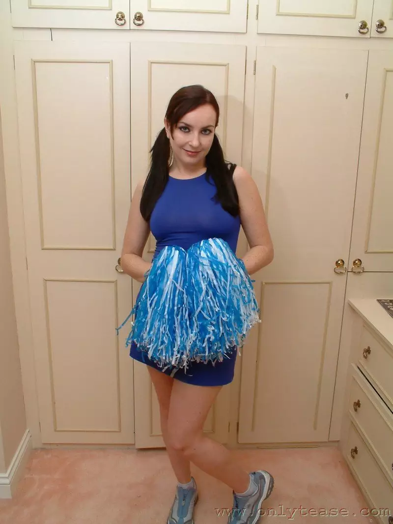 Игривая чирлидерша Jessica Wood снимает синюю форму и трусики и выгибается — Jessica Wood