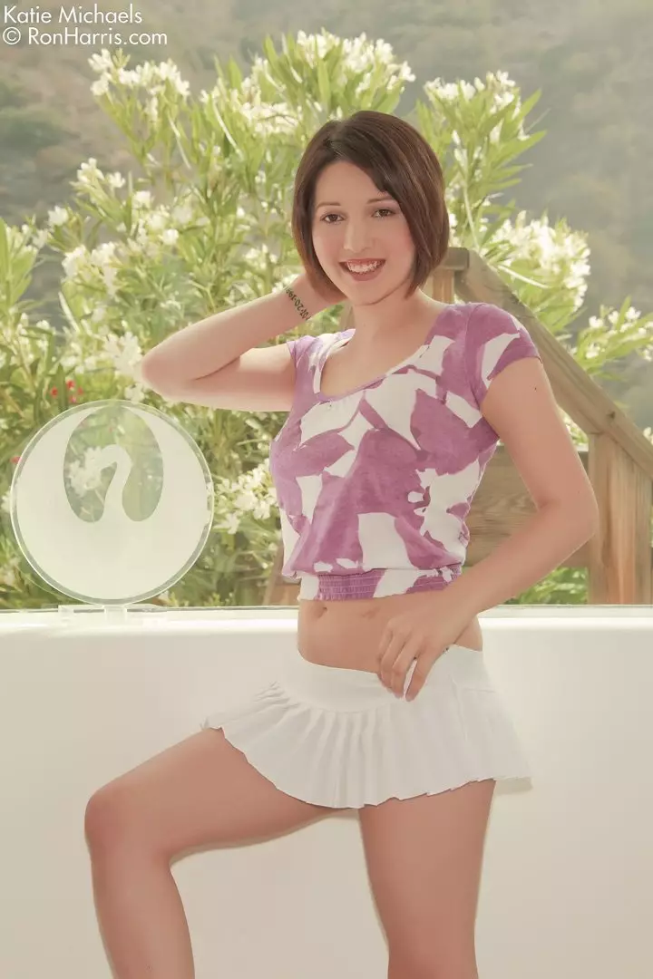 Игривая детка в мини-юбке Katie Michaels показывает стоячую грудь и бритую киску — Katie Michaels
