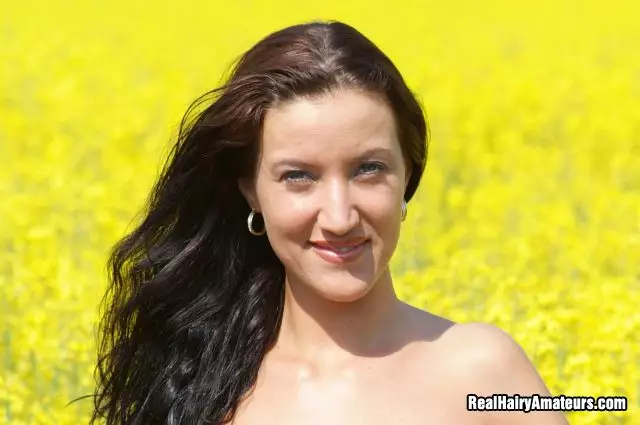 Длинноволосая, грудастая брюнетка Krisztina Ventura в красных трусиках позирует без бюстгальтера в поле — Krisztina Ventura