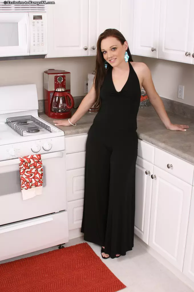 Детка с бритой киской Krystal Jordan снимает свой черный наряд на кухне — Krystal Jordan