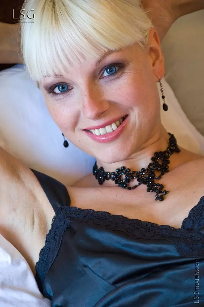 Блондинка в черных чулках и розовых трусиках Lena Cova показывает свою киску в спальне — Lena Cova