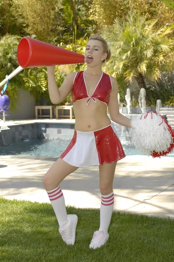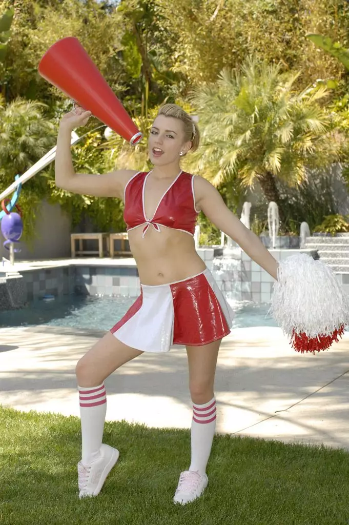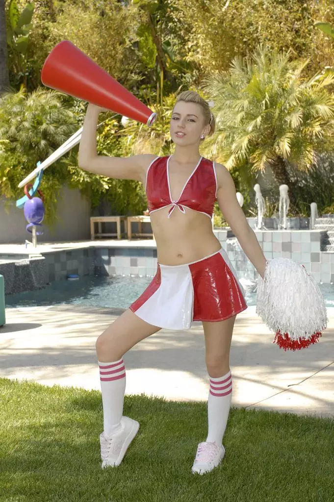 Lexi Belle снимает красно-белую латексную униформу чирлидерши, а потом трахается с членом с видом от первого лица — Lexi Belle