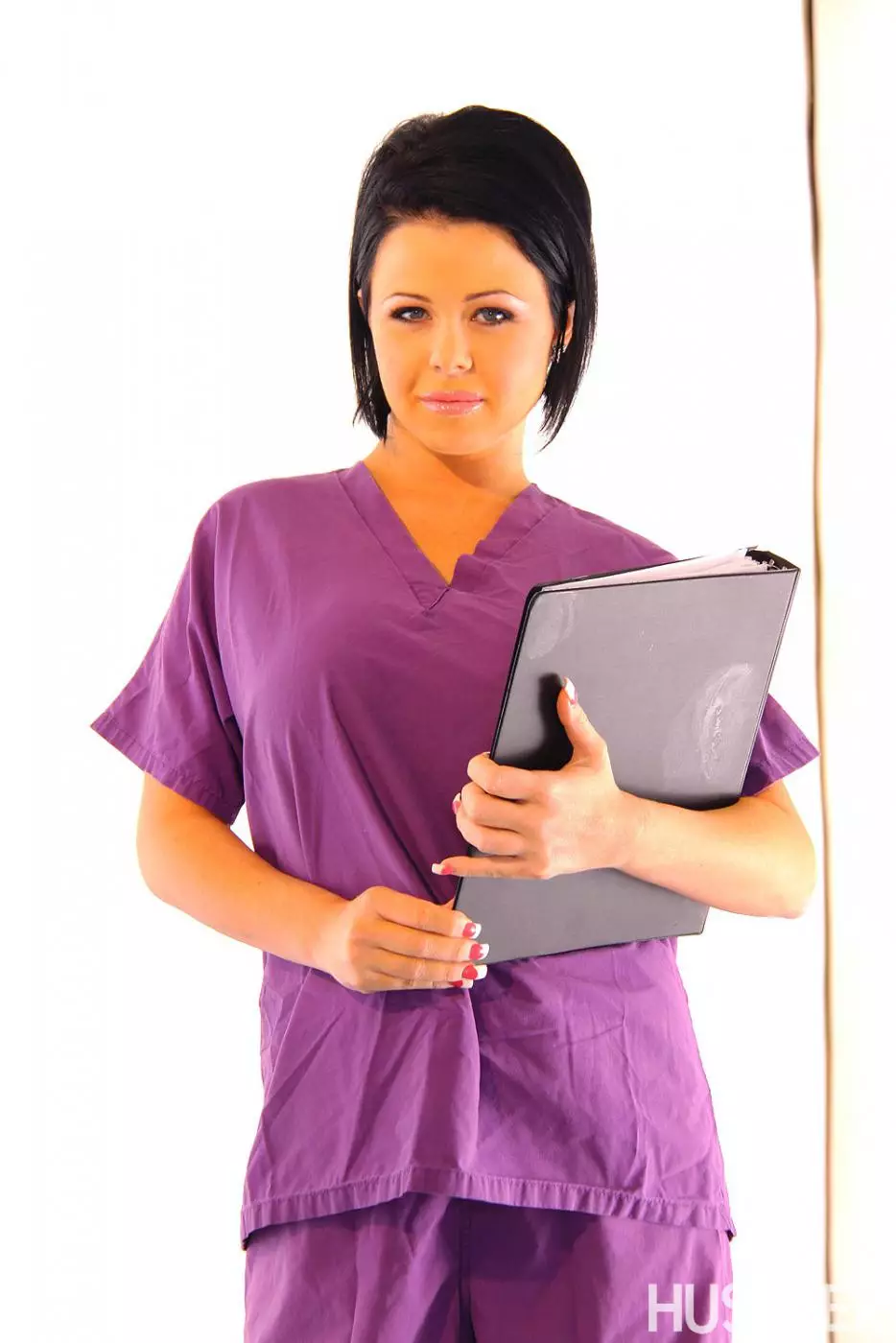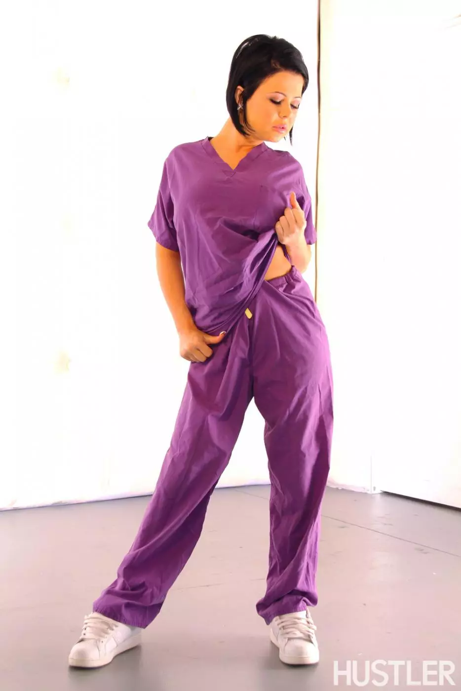 Грудастая брюнетка Loni Evans снимает фиолетовую униформу и черное нижнее белье — Loni Evans