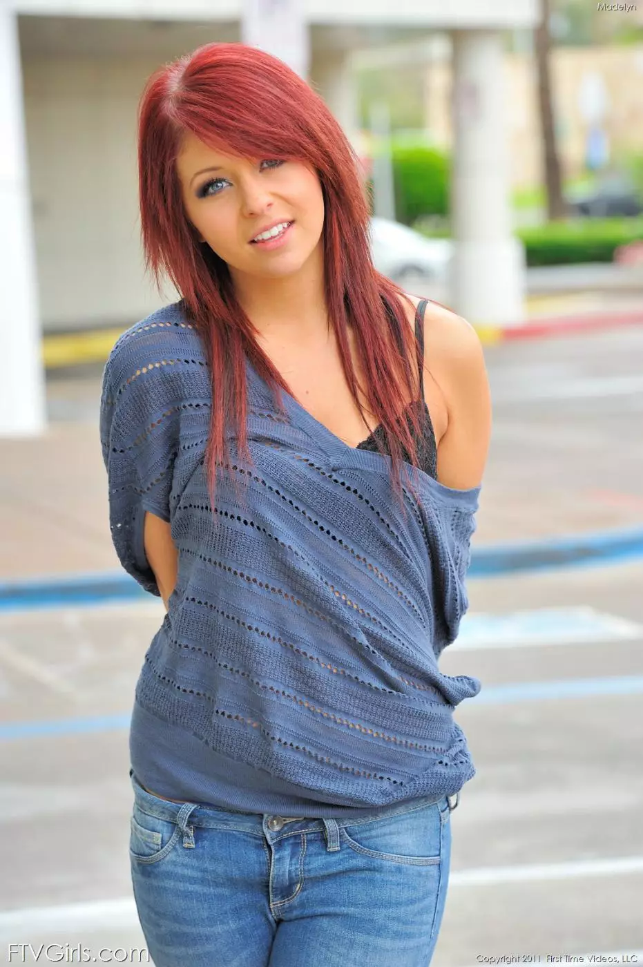 Рыжая малышка Madelyn Monroe снимает джинсы и показывает гладкую киску — Madelyn Monroe