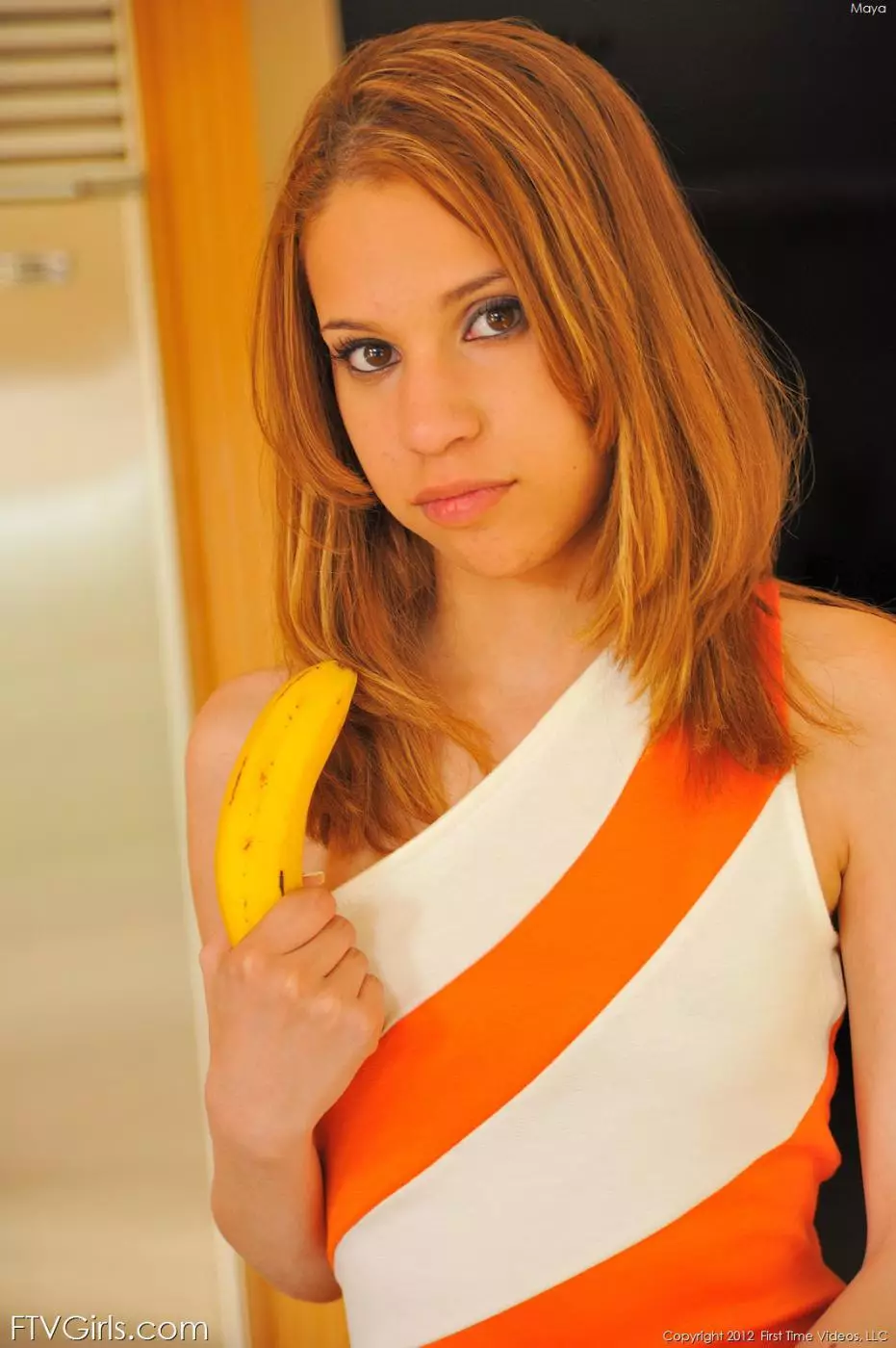 Игривая Mae Olsen в красных туфлях помогает банану исчезнуть в своей дырочке — Mae Olsen