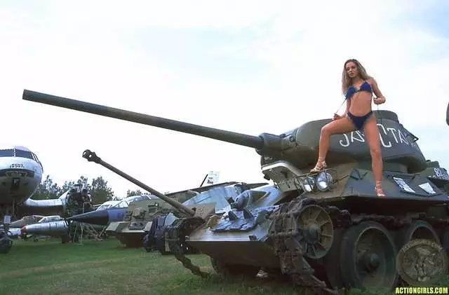 Длинноногая куколка в синем бикини Martina Fox раздевается рядом с танком — Martina Fox