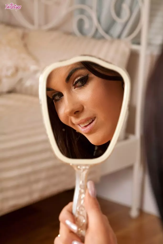 Брюнетка Megan Coxxx скинула свои белые трусики и изучает свою выбритую киску в зеркале — Megan Coxxx