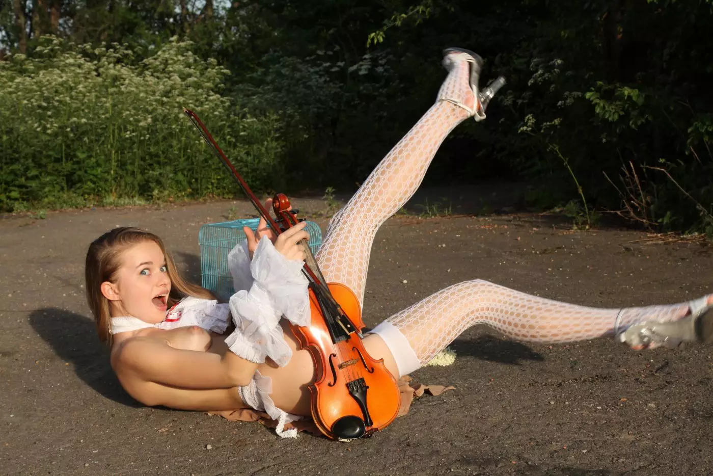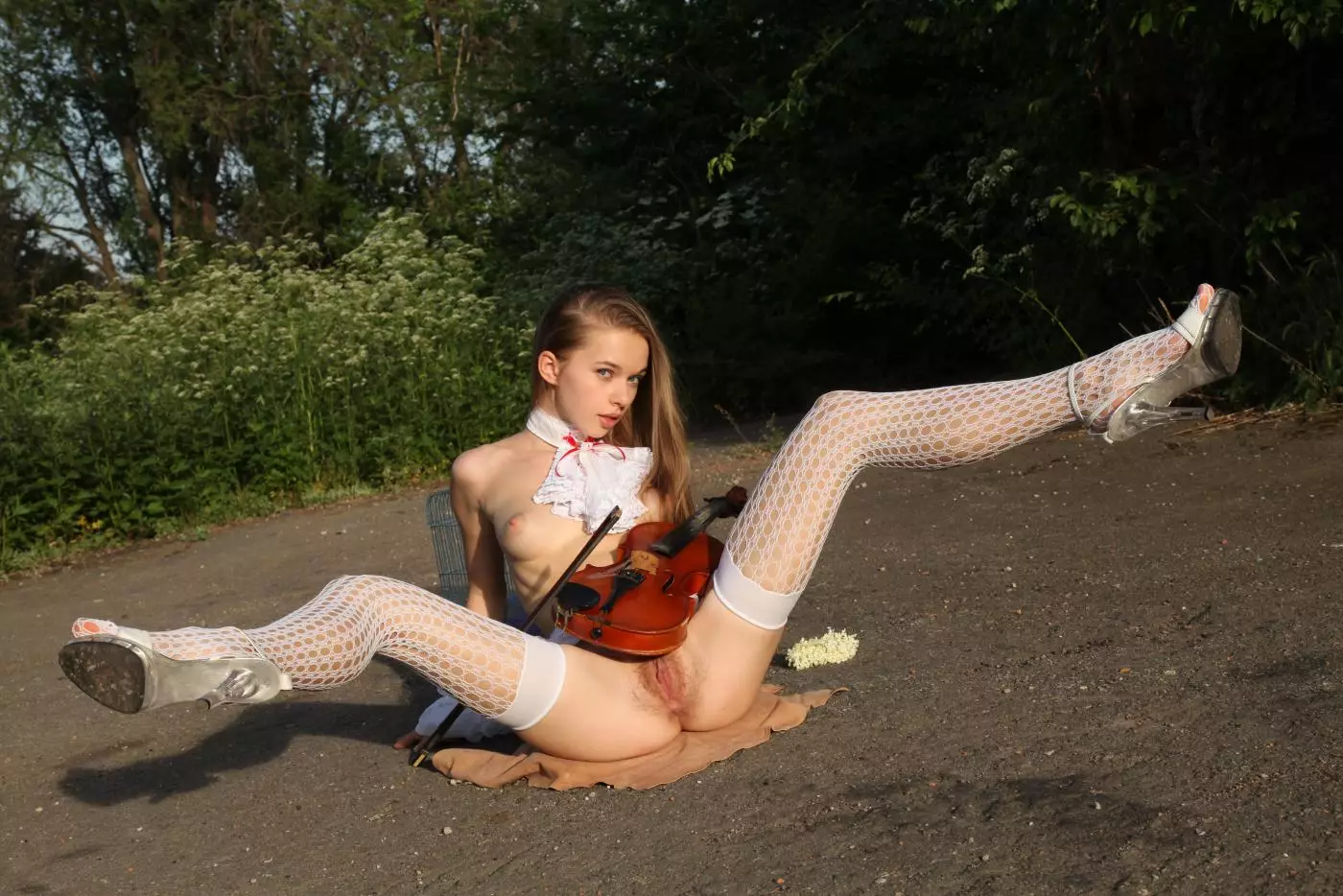 Сексуальная девушка Milena D играет на скрипке на природе в чулках и подвязках — Milena D