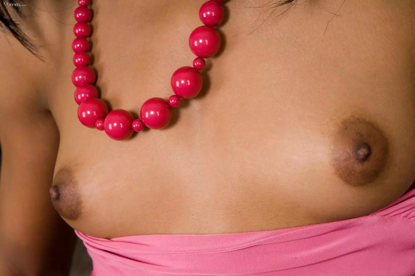 Темнокожая и стройная детка в розовом платье с трусиками Misty Stone играет с белым дилдо — Misty Stone