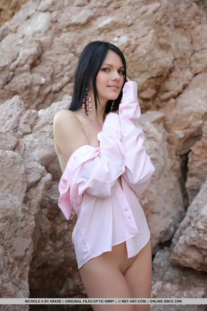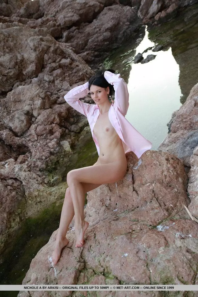 Соблазнительная юная брюнеточка Nichole A сладко потягивается, лежа нагишом на скалах — Nichole A