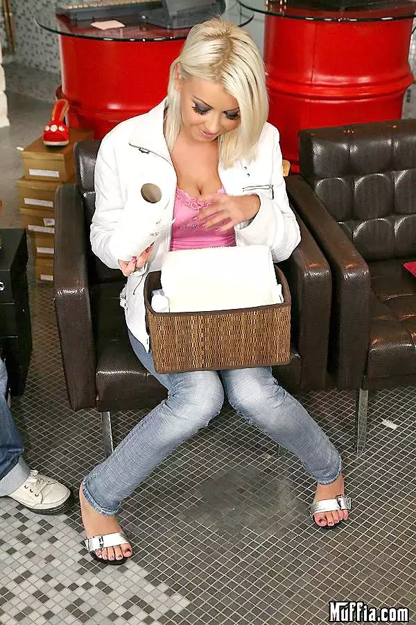 Гламурная блондинка Nikki Blond снимает джинсы и трусики и работает стопами — Nikki Blond