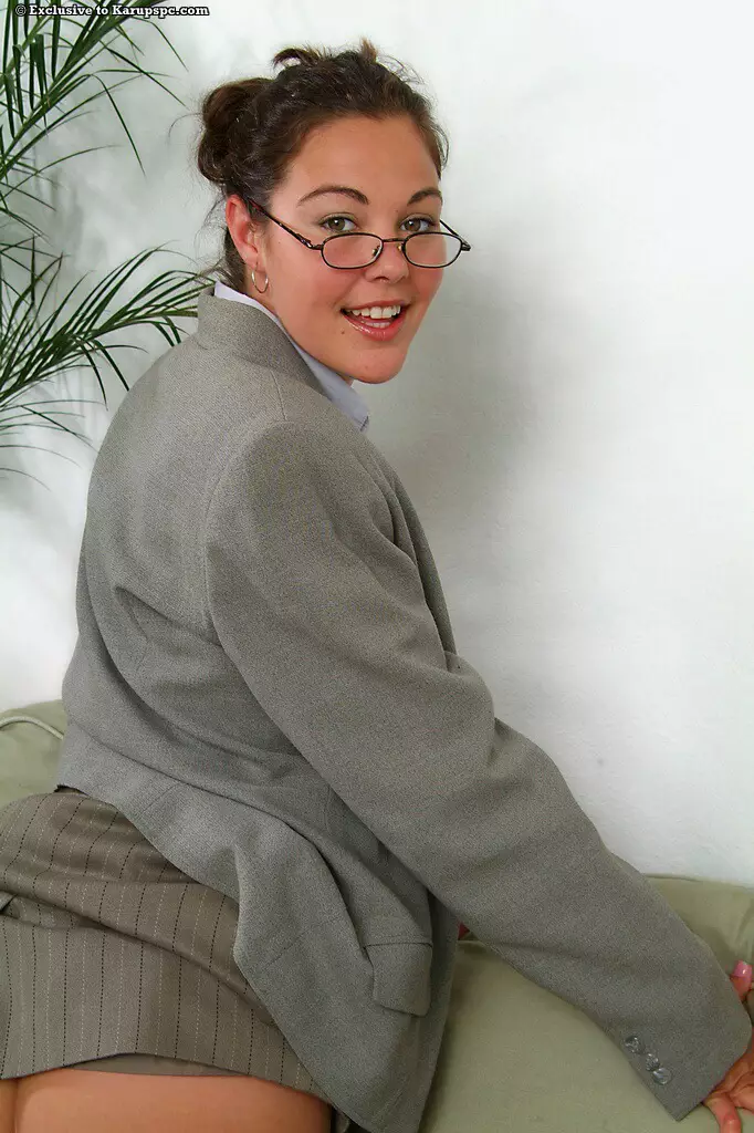 Брюнеточка Ria Lynn в очках и офисная униформе раскрывает свои ножки чтобы показать свою пизду — Ria Lynn