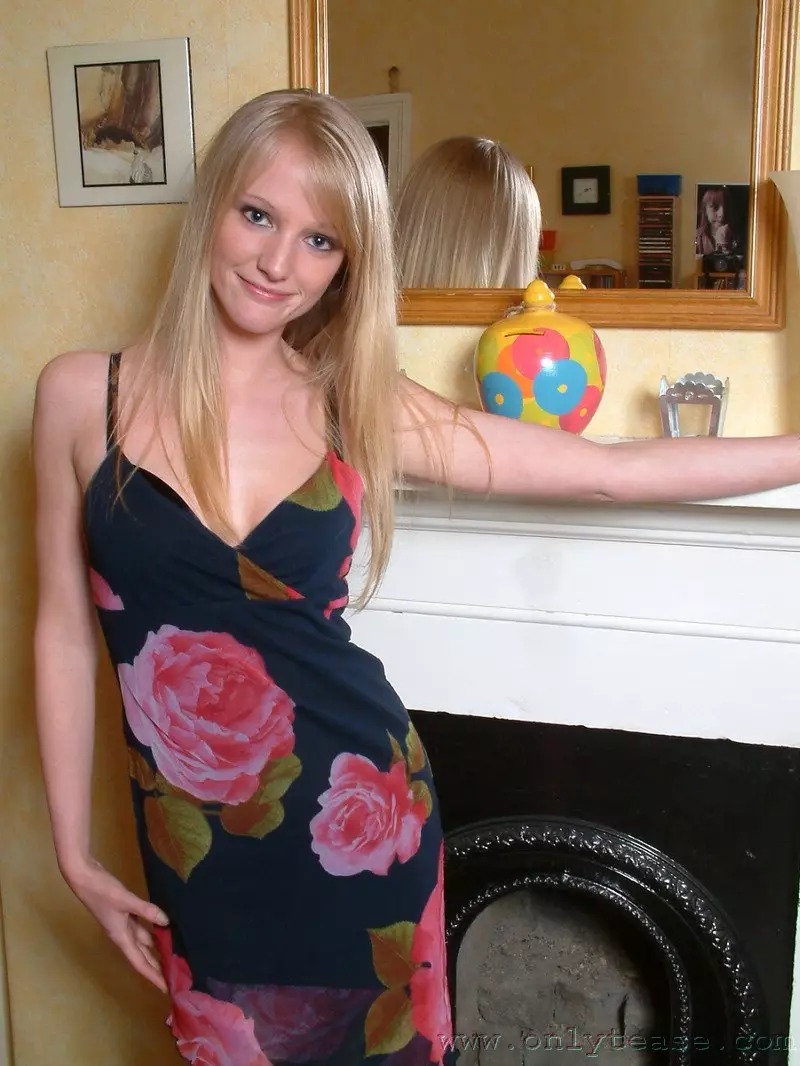 классная белокурая цыпочка Sharon Onlytease позирует в платьице и нижнем белье у камина — Sharon Onlytease