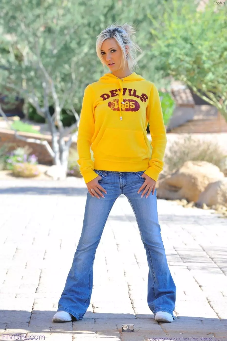 Негодная блондинка Sophia Knight снимает сначала топ, а потом синие джинсы на свежем воздухе — Sophia Knight