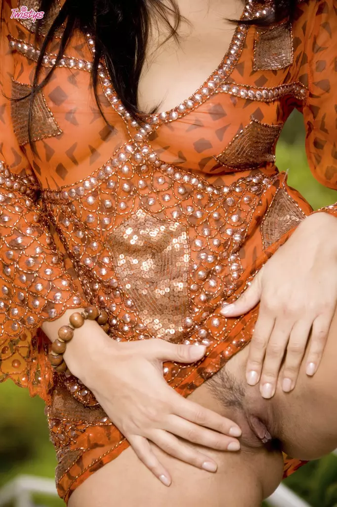 Роскошная брюнетка Sunny Leone засовывает ручку себе под тунику, чтобы показать грудь и поиграть со своей киской — Sunny Leone