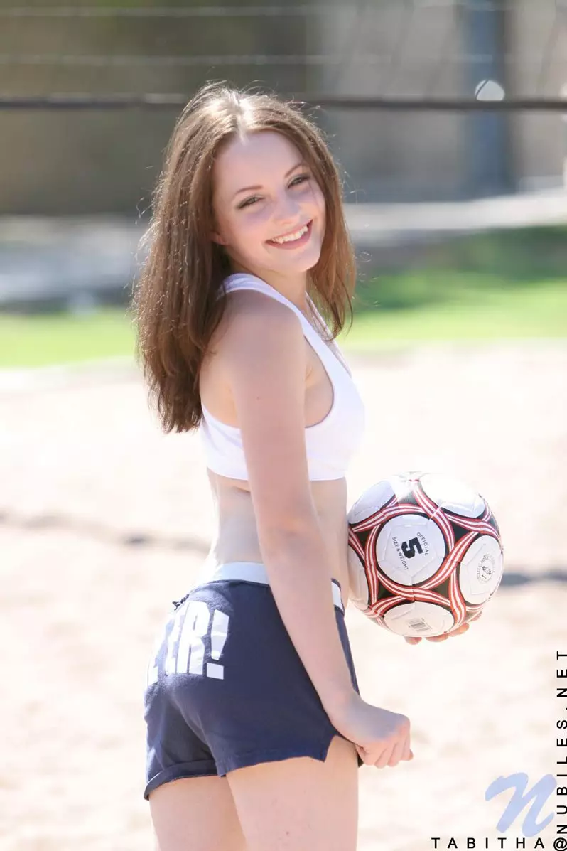 Улыбающаяся спортивная детка в белоснежном топе и синих шортах Tabitha Tucker позирует с мячом на улице — Tabitha Tucker