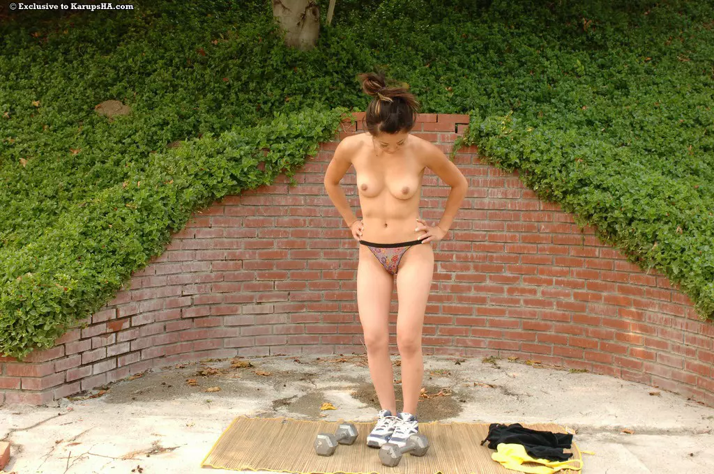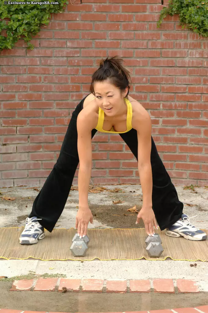 Спортивная азиатская цыпочка Taya Talise с выбритой киской снимает свою обтягивающую форму прямо на улице — Taya Talise